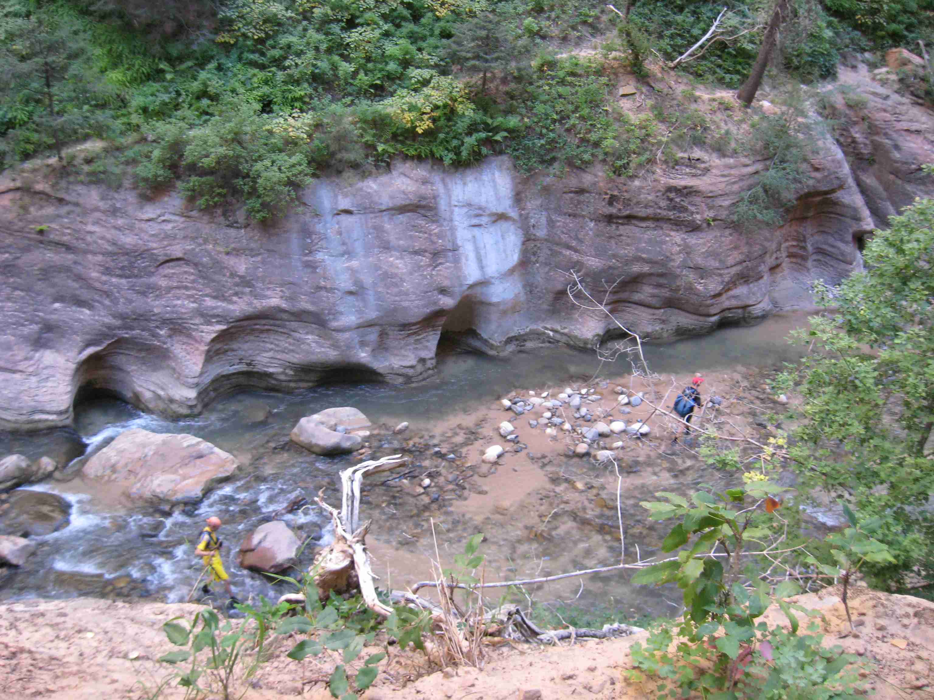 In July I made an abortive attempt to hike the 16 miles from the ranch at the head waters, down the Virgin river to the Sinuwava Temple. We decided that the constrictions last time made it impossible (and I confirmed on this hike that we were right - starting after noon and going to campsite #8 would have been a disaster for our group), so we hiked up from the bottom to just short of Orderville canyon. Pictures of that trip can be seen at http://donaldhanes.com/3days/DayNarrows.html This time we (Mike Dowd and I) made it. Easily for Mike and with only mild problems for me (caused by having poor equipment).